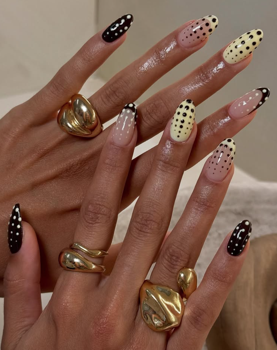 The black and white polka dot nails keep things timeless, while the cream base softens the overall vibe and makes it feel wearable with anything from a slip dress to an oversized blazer.